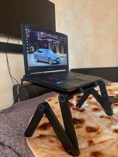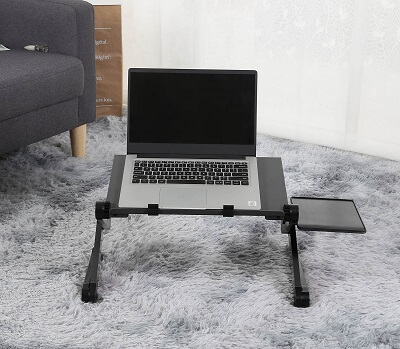 This is a very good laptop stand. The stand can be modified to suit any need for a mini desk. I like how secure it is and that it includes bumpers so that your laptop will not slide off the surface if you choose to have it at an angle. Overall, this foldable laptop desk is an excellent convenient product.