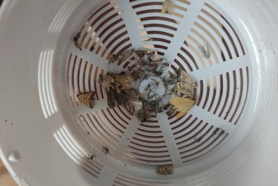 Situated at the bottom of the vacuum fan, it gives them nowhere to escape. The vacuum motion quickly drys and kills them.