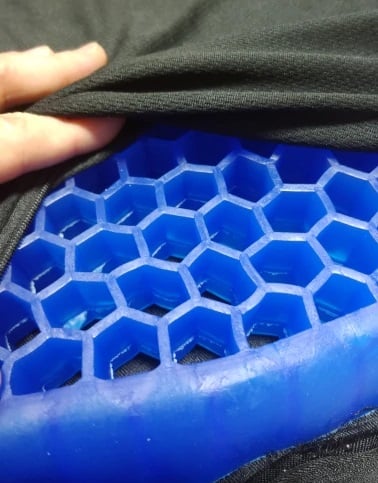 It breathes well, the gel stays cool in hot weather. It gives me just the right amount of padding. I’m 160 pounds. Keep the bottom where it is. I liked it so much that I bought another passenger seat. Recommend it!