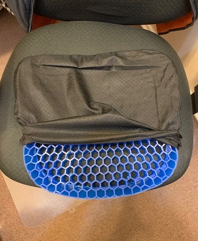 I have found that it does in fact help make sitting more comfortable for longer periods of time. It doesn’t slip on the chair, I found that it stays where I put it. And I have found that it does keep the seat cooler – which improves the comfort.