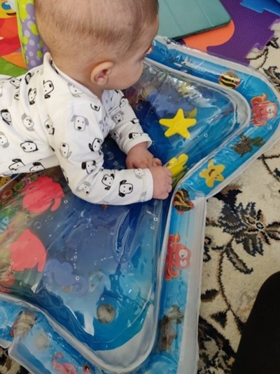 This water play mat is great. It’s colorful, does not leak, perfect size for tummy time. Make sure to blow up completely and fill with water for overall comfortability. My grand son really enjoy it.