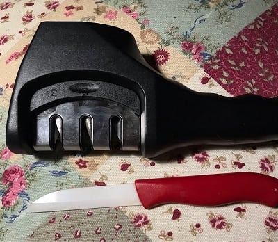 I like this little knife sharpener and it is easy to use and small enough to be stored in a drawer.
