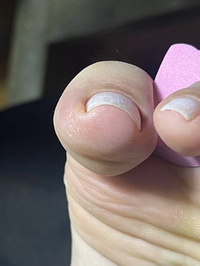 Step 1: Clean and thoroughly dry the toenails and surrounding skin. Peel the sticker from the backing, center it across the toenails, and press the ends so they hug each sidewall snugly.