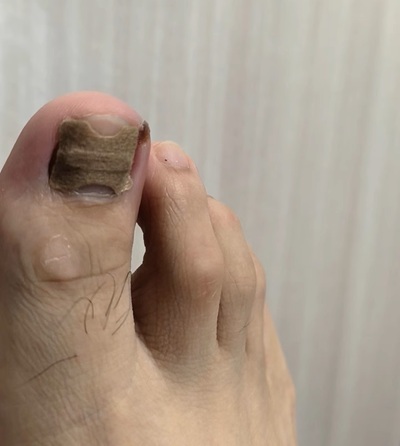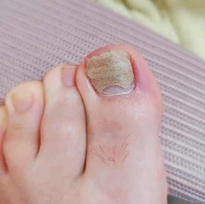 Step 1: Clean and thoroughly dry the toenails and surrounding skin. Peel the sticker from the backing, center it across the toenails, and press the ends so they hug each sidewall snugly.